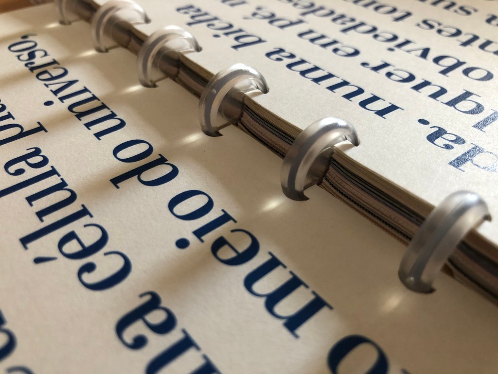 “b: não-coreografias ou florilégios” foi construído para ser um espaço-tempo interior que se desdobra para fora em camadas a construir novos sentidos. Sua natureza é ser um objeto aberto e mutável, um convite para a fruição criativa do leitor. A encadernação com argolas removíveis, que permitem movimentar as páginas com facilidade, motiva o leitor a construir e desconstruir seus trajetos de leitura, assim como os recursos de realidade aumentada, trabalhados aqui na disciplina EDIT, que também rompem com a linearidade das narrativas, introduzindo novas camadas de informação a partir de conteúdos complementares, acessíveis somente através do uso da tecnologia.