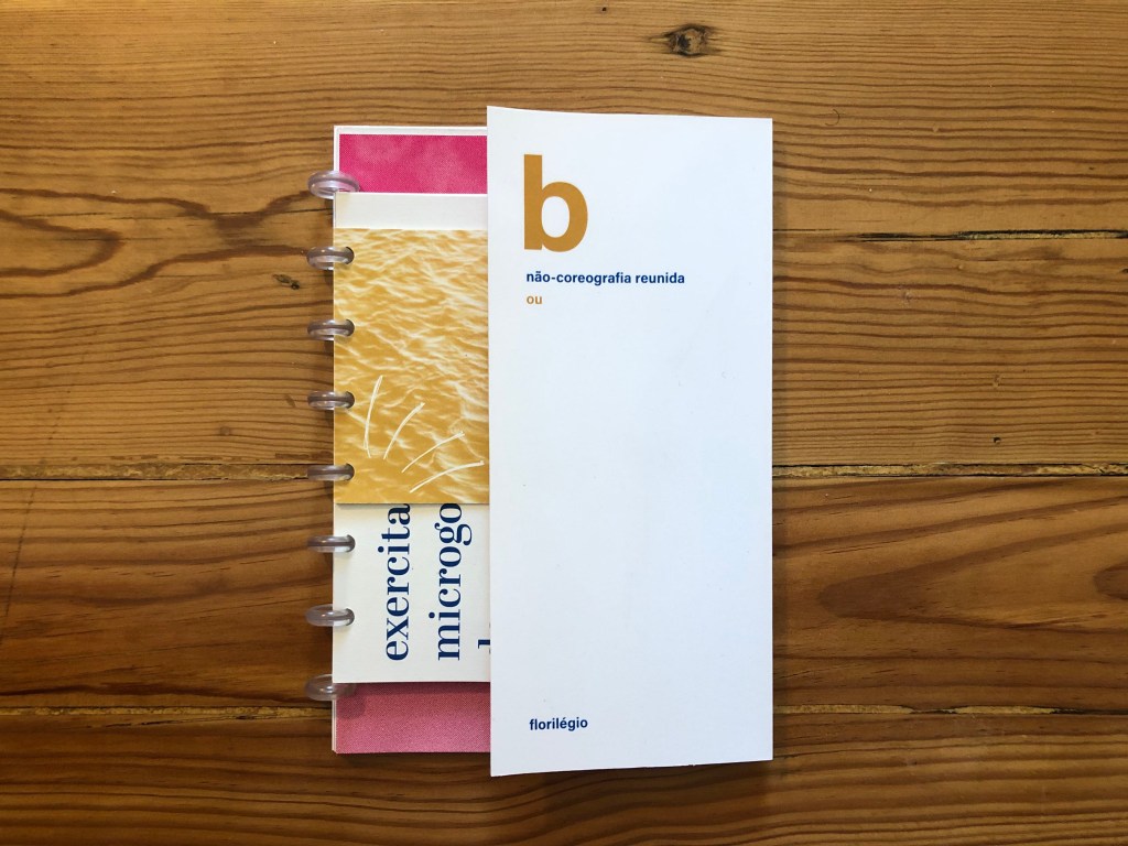 O livro “b: não-coreografias reunidas ou florilégios”, idealizado para a disciplina PPTEC-2, foi construído tendo-se como base dois conceitos: o de arquivo e o de fragmento. É uma compilação de registros de ações dispersas, anotações visuais, vestígios de escritas e gestos que acompanharam a jornada íntima e profissional do meu amigo Bernardo RB, escritor e performer, nos últimos anos, entre as cidades de Lisboa (Portugal) e Belo Horizonte (Brasil). Esse livro nasceu do ato de percorrer memórias e, sobretudo, de um ato de entrega, pois para criar o livro Bernardo me permitiu viajar com liberdade pela sua gaveta de cadernos, pelos seus ficheiros digitais e por outros guardados, a fim de selecionar conteúdos para a edição da publicação.