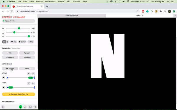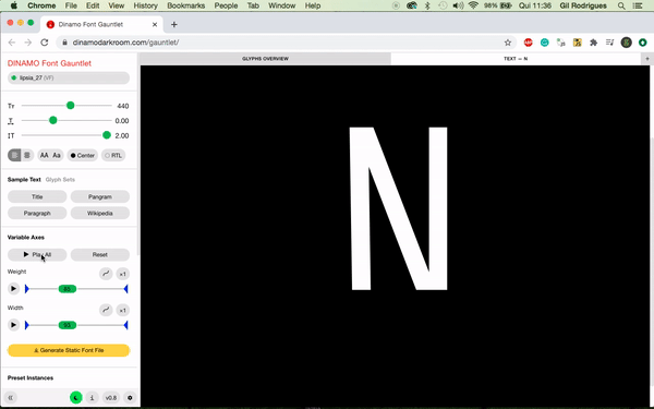 Após a exportação, carreguei o ficheiro de fonte na plataforma online de testes Font Gauntlet da ABC Dinamo. Apesar de satisfatório, pois a fonte funcionava de modo dinâmico, logo percebi erros que me haviam escapado anteriormente.